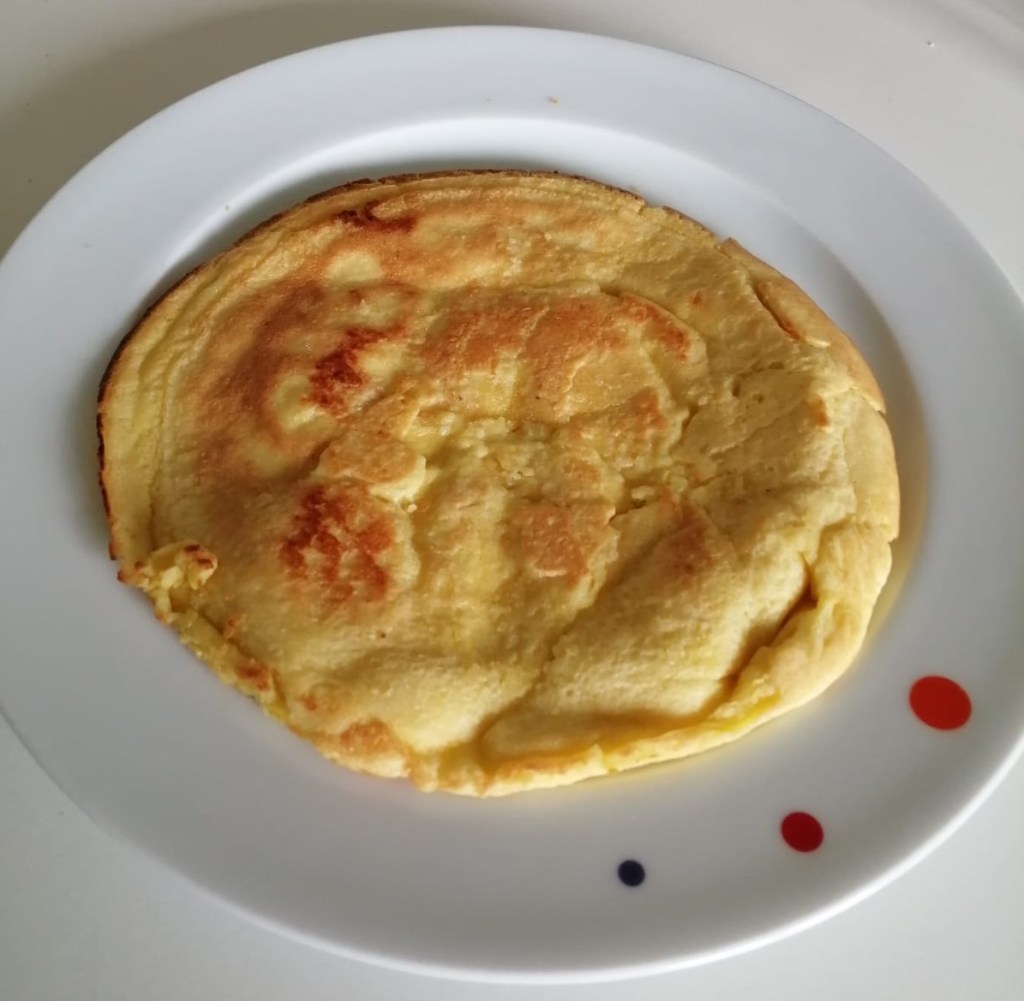 Los ingredientes son los mismos: huevo, coco rallado, almendra y aceite de oliva virgen extra, y el procedimiento también: lo batimos todo junto con la batidora, pero, en vez de ponerlo en el micro, lo echamos en la sartén, vuelta y vuelta.