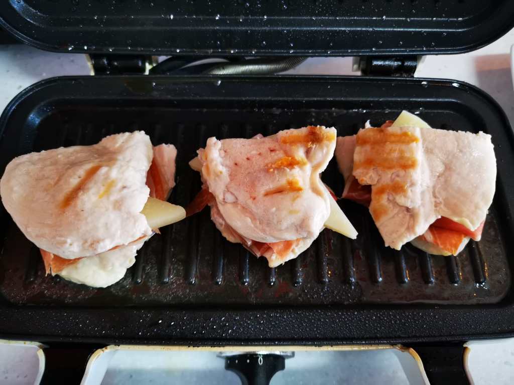 Para hacer las pechugas podemos usar la misma sandwichera, tal y como se ve en la foto, y añadimos el jamón y el queso, como si fuera un sándwich.