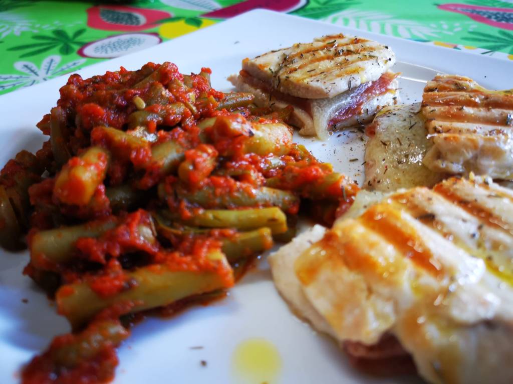 Para acompañar estaría bien incorporar alguna verdura que toleremos. En este caso hemos puesto judías verdes salteadas con salsa de tomate natural (si la tenéis que comprar, fijaos que solo sea tomate triturado) a la que hemos añadido orégano, jengibre, cúrcuma y un toque de nuez moscada.