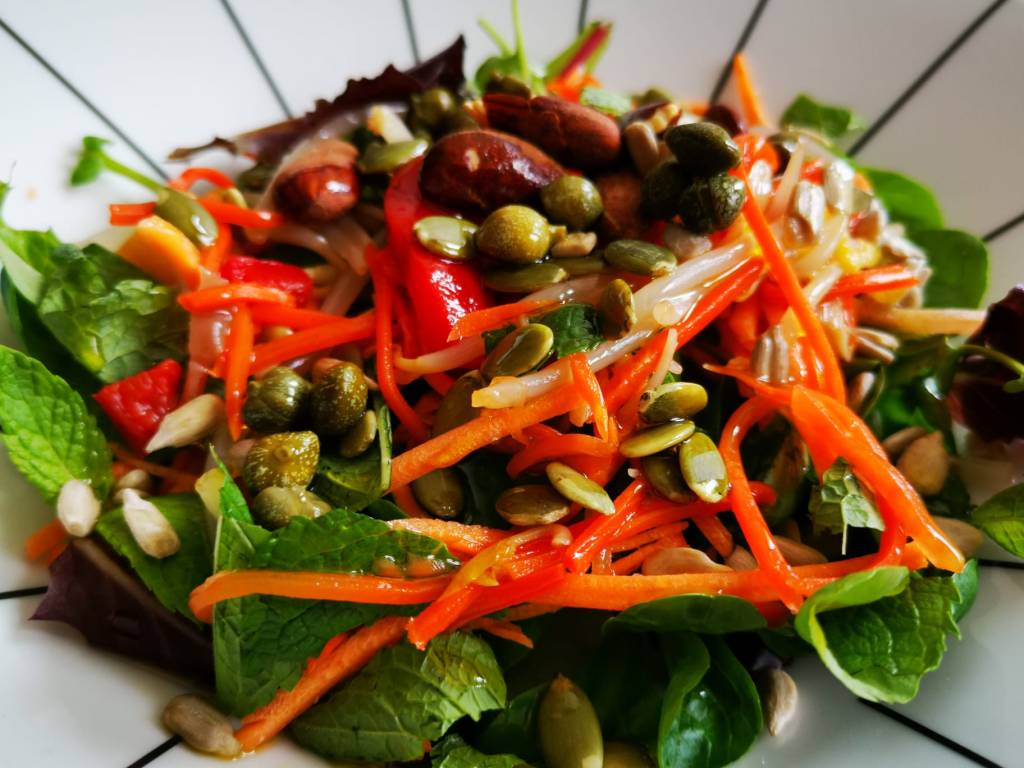 En esta ensalada, que hemos puesto como ejemplo 1, tenemos: brotes tiernos, zanahoria rallada, alcaparras, pimiento rojo, brotes de soja, pipas de girasol y calabaza, almendras, unos toques de hierbabuena, aceite de oliva y vinagre de manzana 🙂