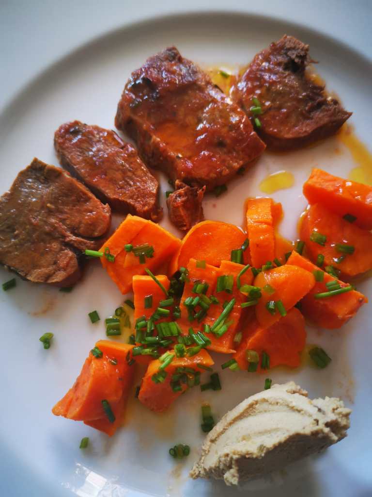 Esta vez la hemos acompañado de boniato enfriado con un toque de cebollino cortado, y con un pequeño acompañamiento de humus bajo en Fodmap (garbanzos cocidos de bote, tahini, zumo de limón y aceite infusionado con ajo). Fijaos en la cantidad. Ideal para reintroducir legumbres poco a poco 🙂