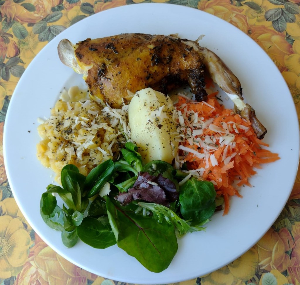 La proteína en este caso es muslo de conejo (hecho en una olla de cocción lenta con muuuuchas especias 😄). Y es que cuando recomendamos priorizar las carnes blancas, muchas veces nos quedamos con el pollo y el pavo, y no salimos de ahí, pero no hay que olvidar que hay otras aves como pato o codorniz, y que el conejo también se considera carne blanca y con muy poca cantidad de grasa (para los que tengan que limitar la grasa animal).