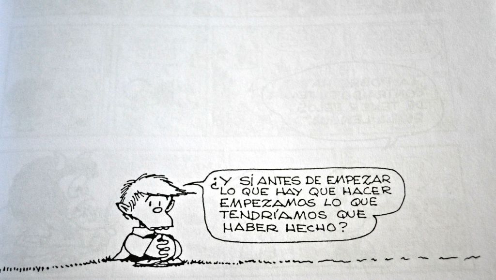 Los libros de Mafalda son pura filosofía. Esta frase me parece buenísima: «Y si ante de empezar lo que hay que hacer empezamos lo que tendríamos que haber hecho?»