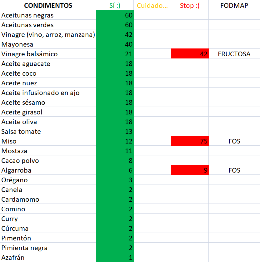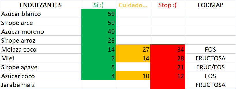 ¡Ojo a los endulzantes! Que no son para utilizar alegremente por muy aptos que sean. Esto es como la lista de las bebidas alcohólicas, que estén aquí no significa que haya que tomarlos, pero que, de tener que tomar alguno, estos son los más bajos en FODMAPs.